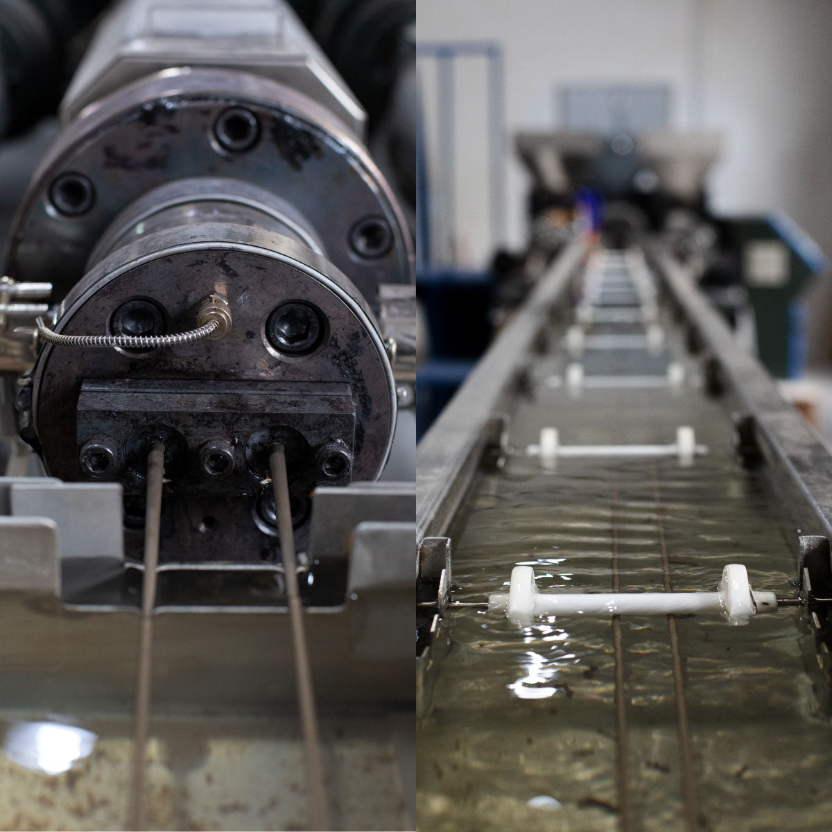 La corde est extrudée directement dans un bain de refroidissement pour fixer rapidement la couleur et la forme.