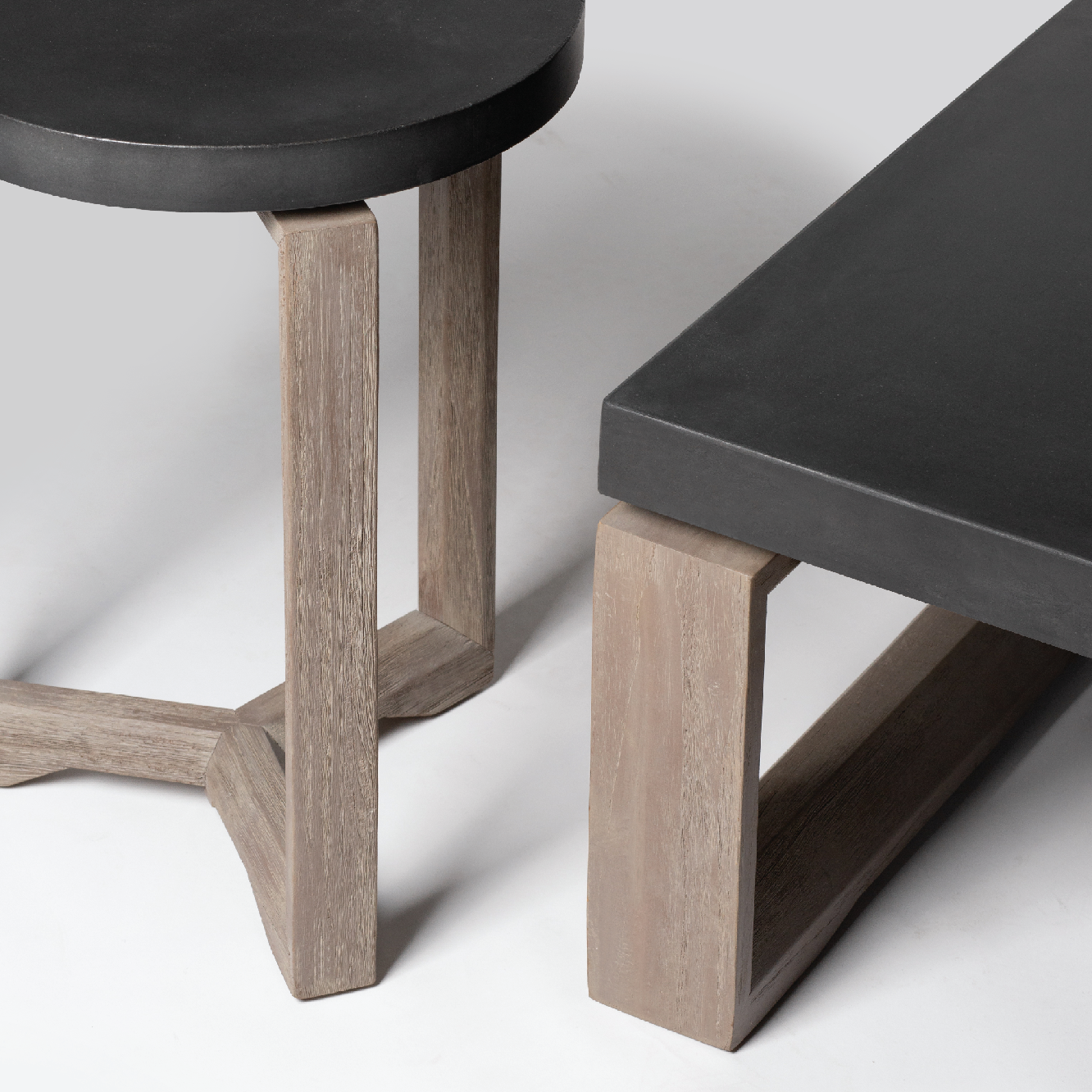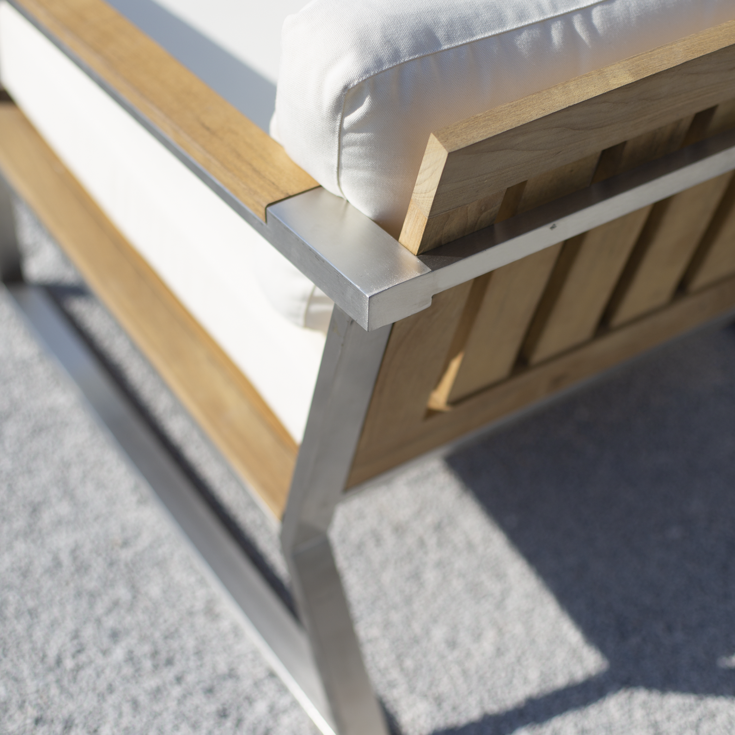 Nous utilisons du teck de haute qualité provenant du monde entier. Le teck vieilli est brossé au fil métallique et fini à la main avec un pigment chaud. Le teck naturel est poncé et huilé pour laisser briller le grain naturel du bois. Les deux finitions bois prendront une teinte argentée avec le temps.