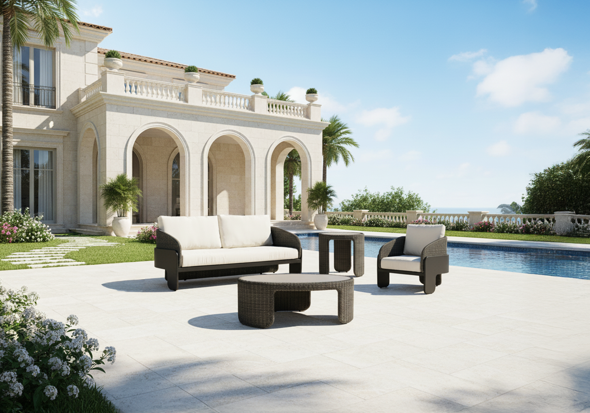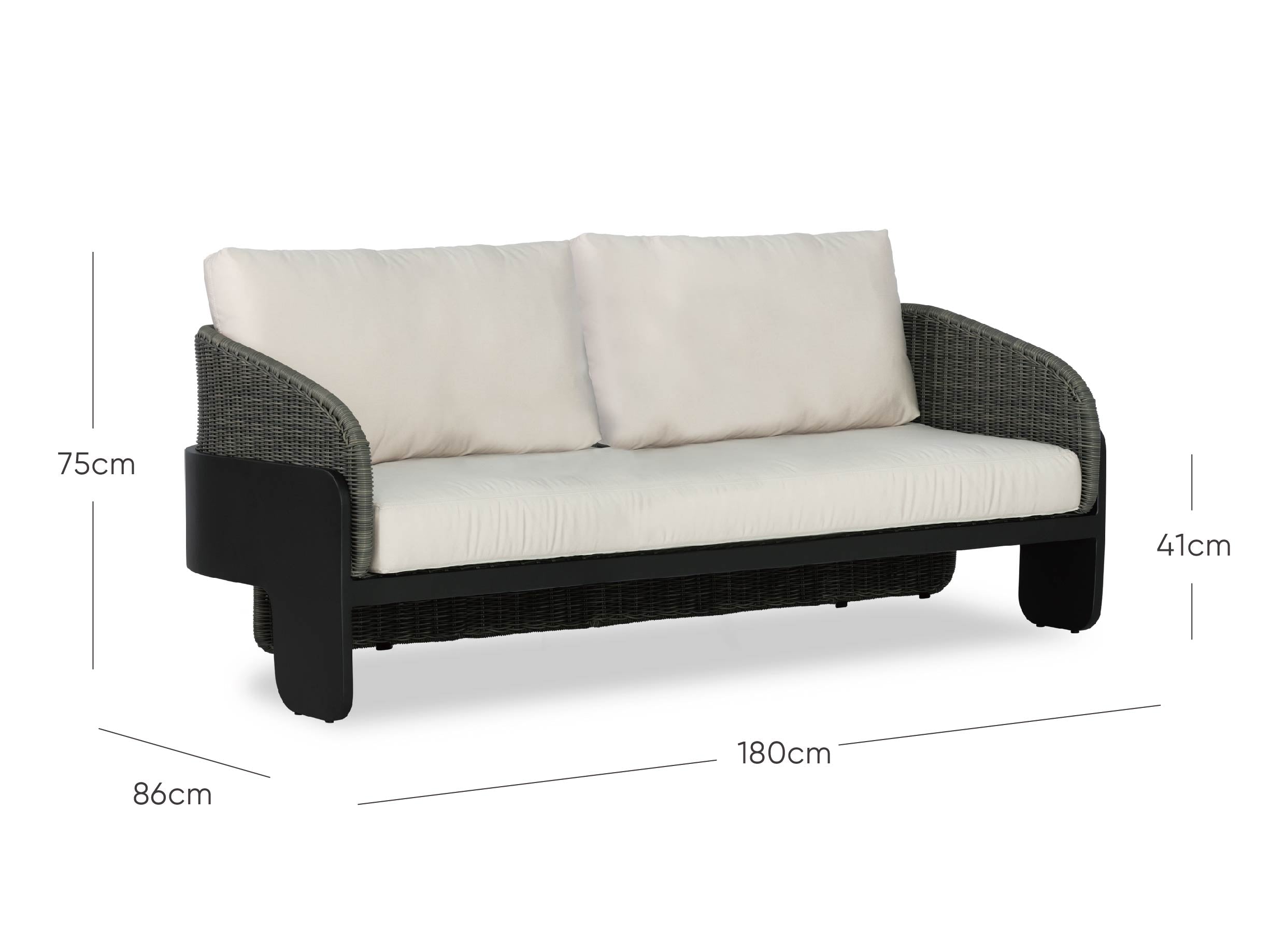 Le coussin d'assise est composé d'une mousse à cellules ouvertes enveloppée de Dacron, ce qui permet à l'eau de circuler et de s'écouler. Le coussin de dossier est garni d'un mélange de mousse, de polyester et de Dacron pour conserver sa forme au fil du temps.