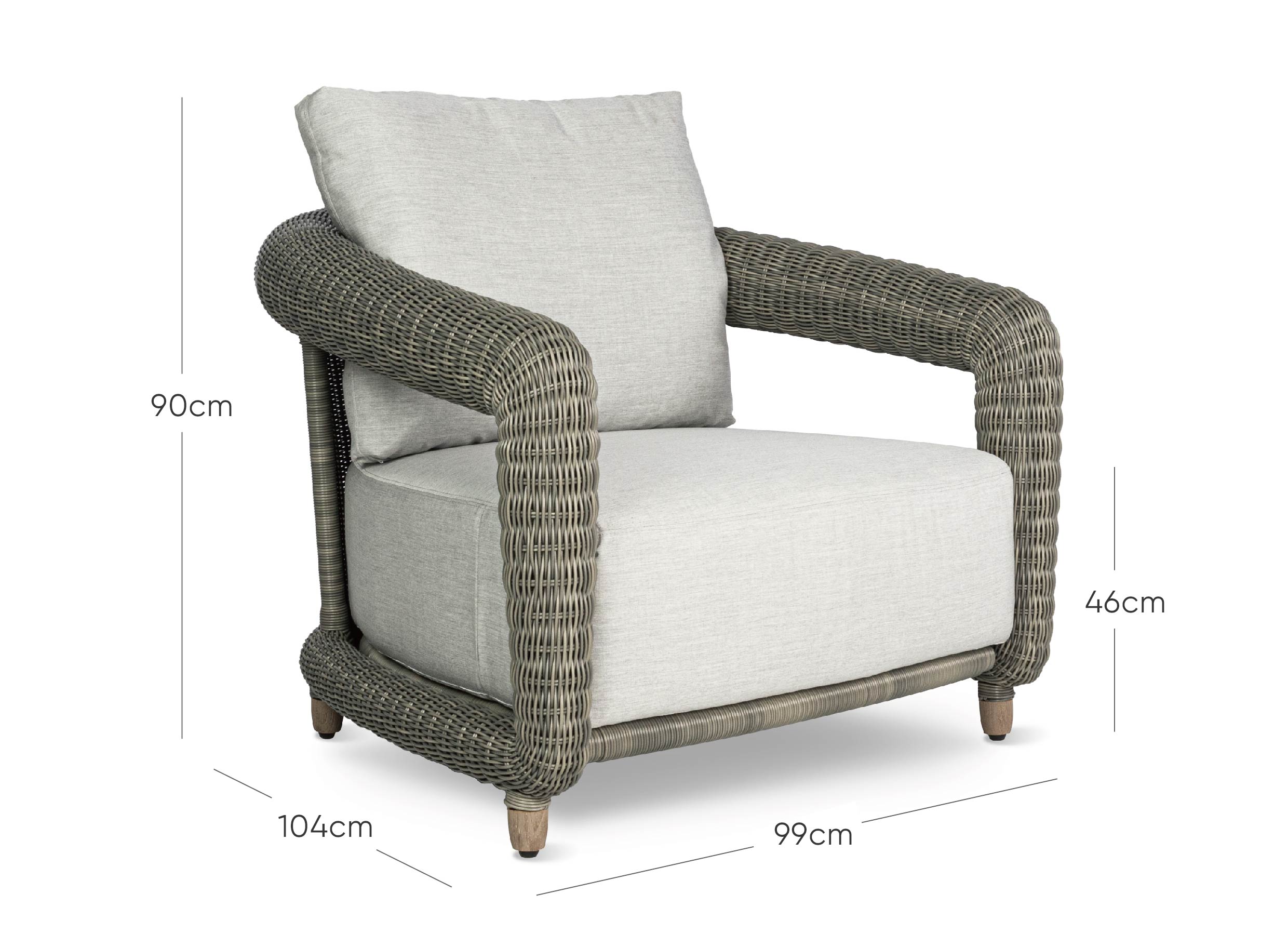 Le coussin d'assise est composé d'une mousse à cellules ouvertes enveloppée de Dacron, ce qui permet à l'eau de circuler et de s'écouler. Le coussin de dossier est garni d'un mélange de mousse, de polyester et de Dacron pour conserver sa forme au fil du temps.