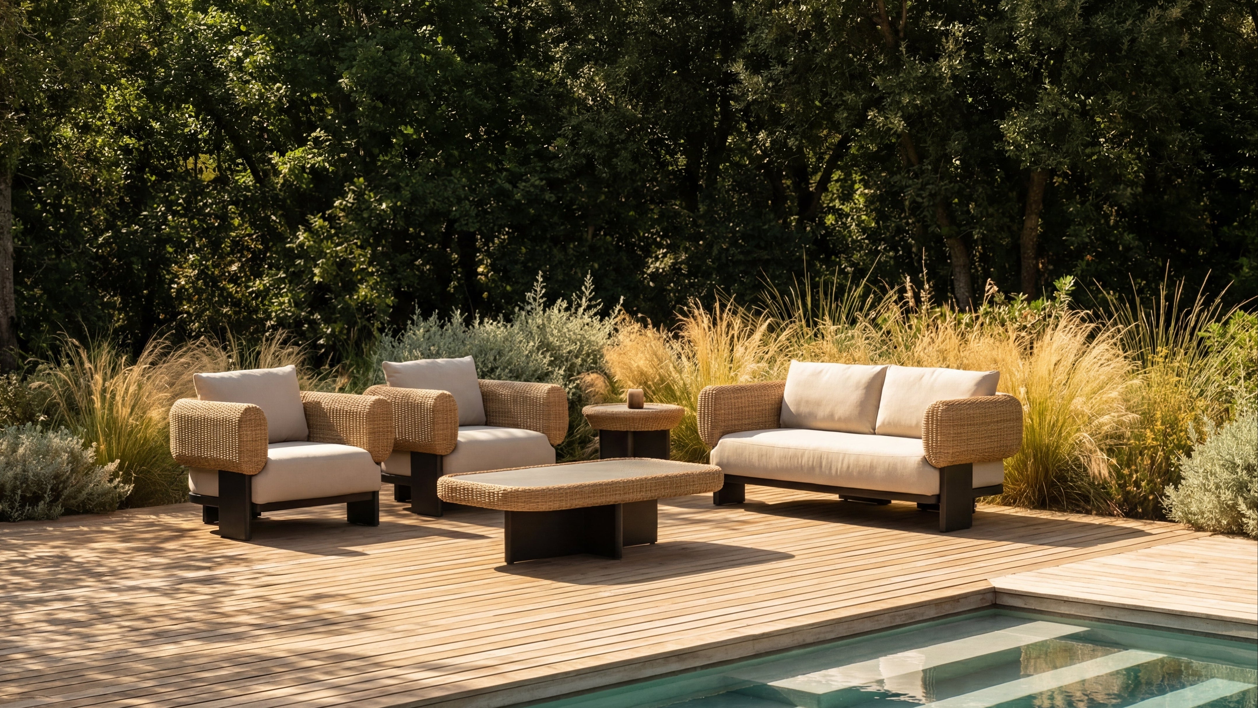 Le coussin d'assise est composé d'une mousse à cellules ouvertes enveloppée de Dacron, ce qui permet à l'eau de circuler et de s'écouler. Le coussin de dossier est garni d'un mélange de mousse, de polyester et de Dacron pour conserver sa forme au fil du temps.