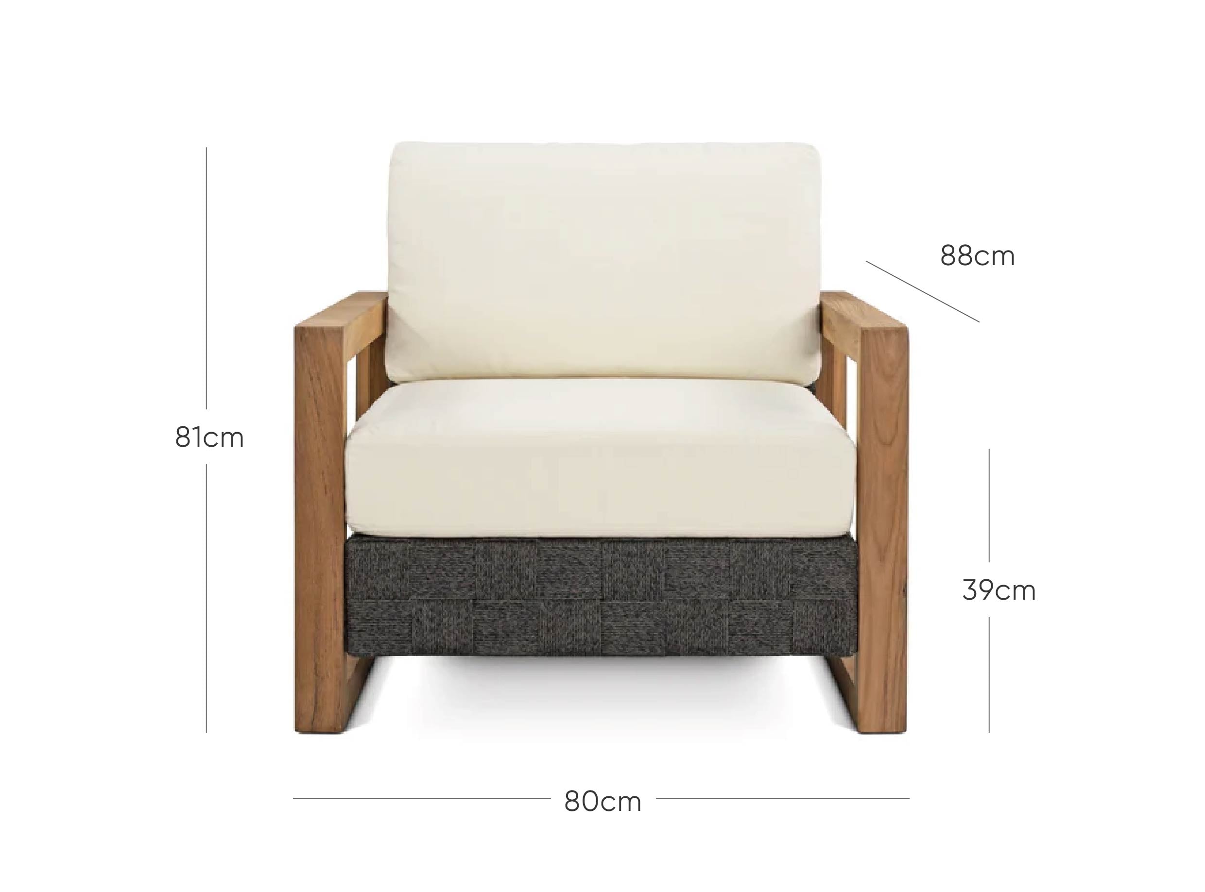 Le coussin d'assise est composé d'une mousse à cellules ouvertes enveloppée de Dacron, ce qui permet à l'eau de circuler et de s'écouler. Le coussin de dossier est garni d'un mélange de mousse, de polyester et de Dacron pour conserver sa forme au fil du temps.