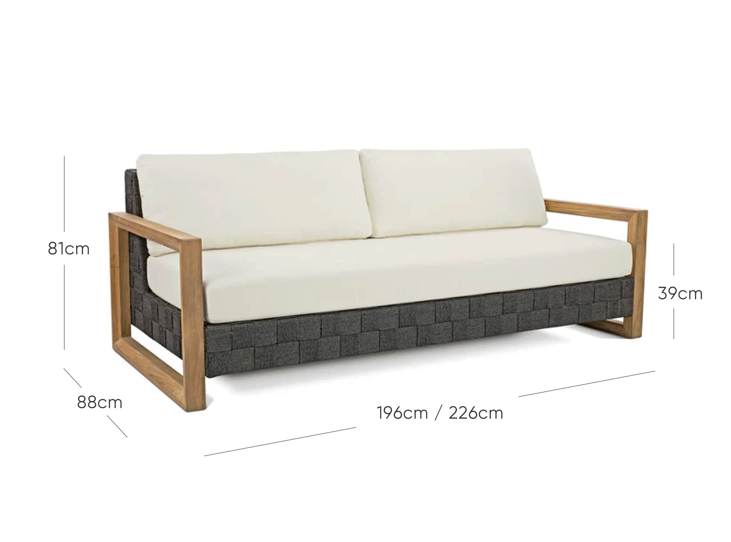 Le coussin d'assise est composé d'une mousse à cellules ouvertes enveloppée de Dacron, ce qui permet à l'eau de circuler et de s'écouler. Le coussin de dossier est garni d'un mélange de mousse, de polyester et de Dacron pour conserver sa forme au fil du temps.