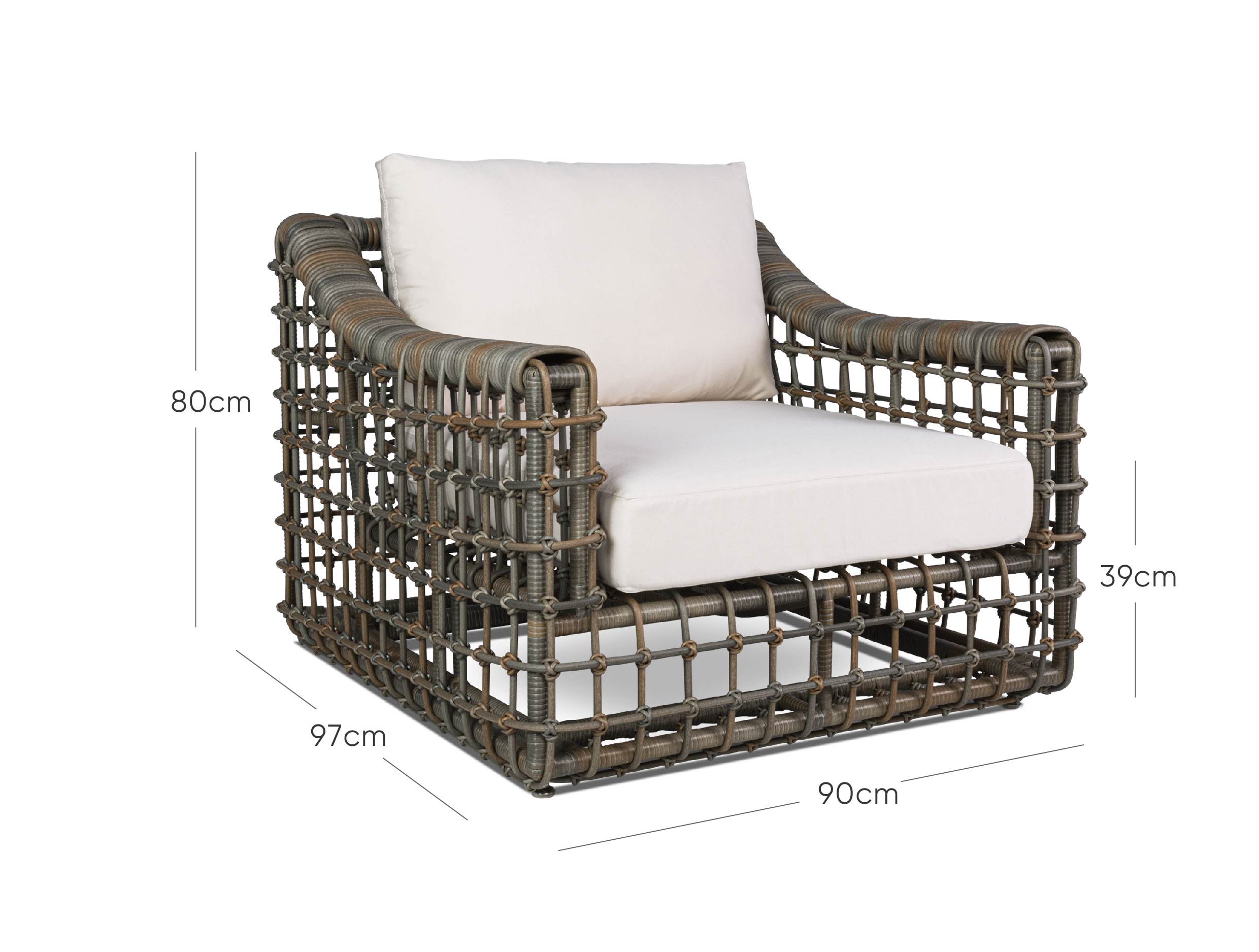 Le coussin d'assise est composé d'une mousse à cellules ouvertes enveloppée de Dacron, ce qui permet à l'eau de circuler et de s'écouler. Le coussin de dossier est garni d'un mélange de mousse, de polyester et de Dacron pour conserver sa forme au fil du temps.