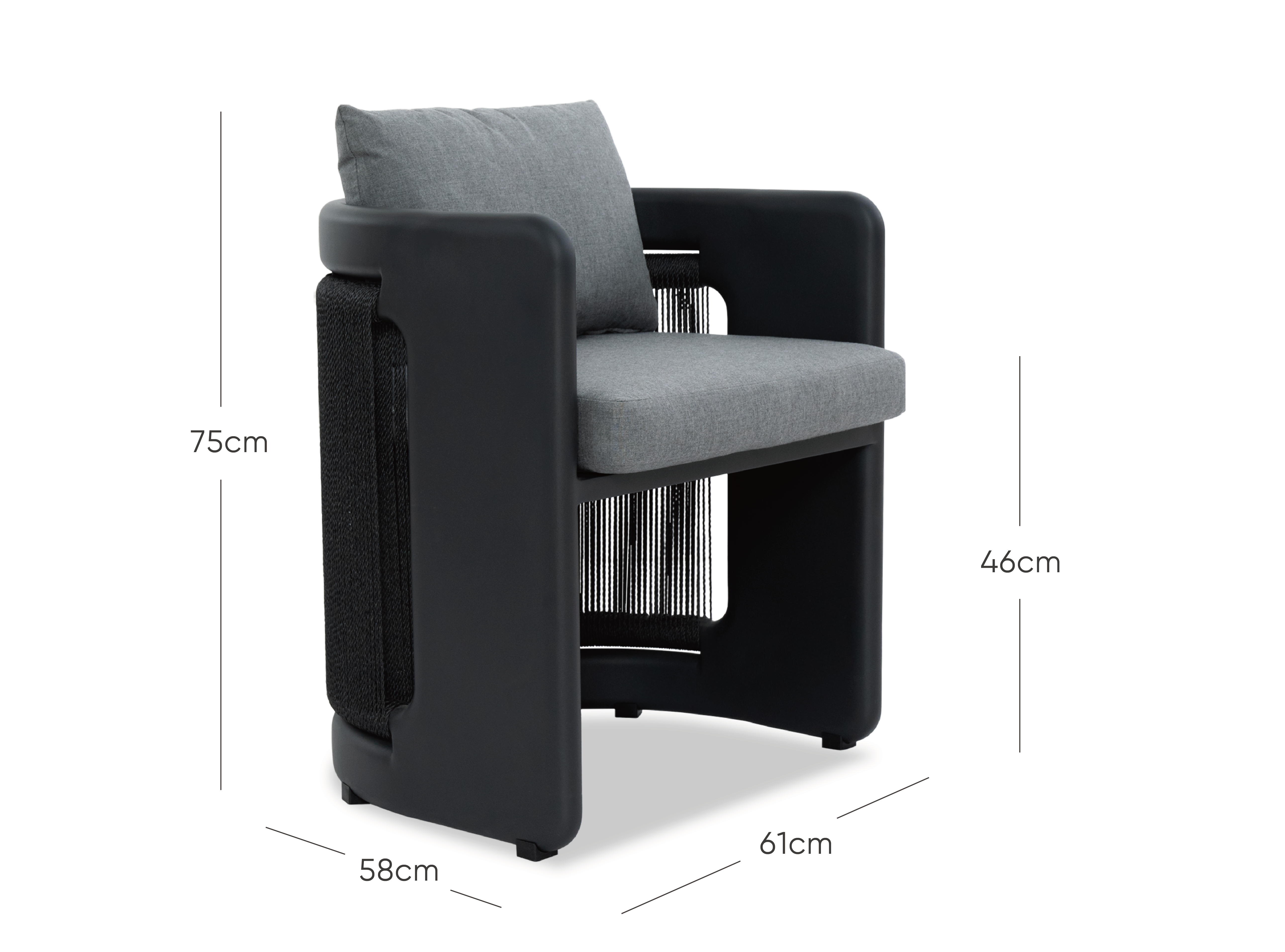 Le coussin d'assise est composé d'une mousse à cellules ouvertes enveloppée de Dacron, ce qui permet à l'eau de circuler et de s'écouler. Le coussin de dossier est garni d'un mélange de mousse, de polyester et de Dacron pour conserver sa forme au fil du temps.