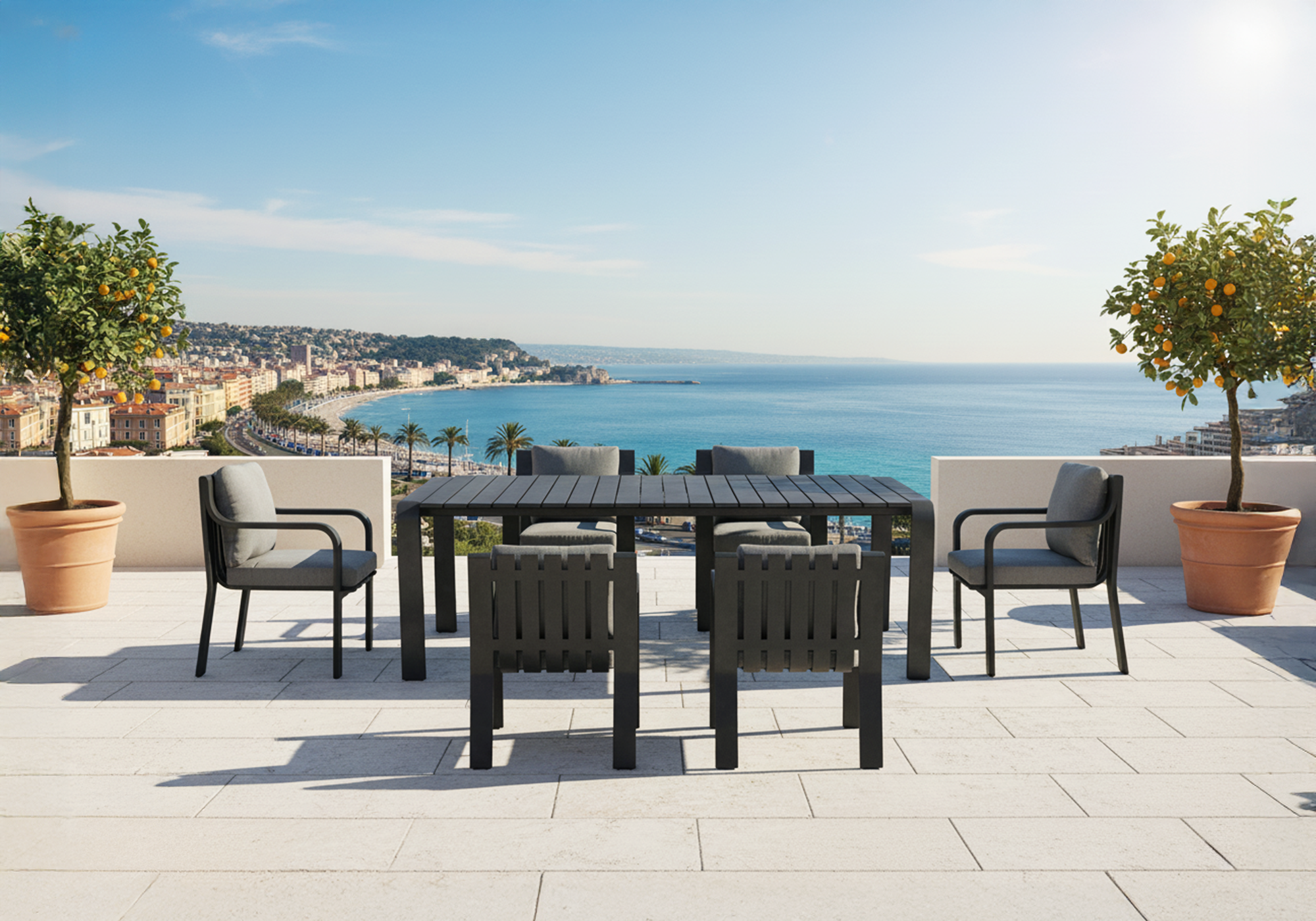 Le coussin d'assise est composé d'une mousse à cellules ouvertes enveloppée de Dacron, ce qui permet à l'eau de circuler et de s'écouler. Le coussin de dossier est garni d'un mélange de mousse, de polyester et de Dacron pour conserver sa forme au fil du temps.
