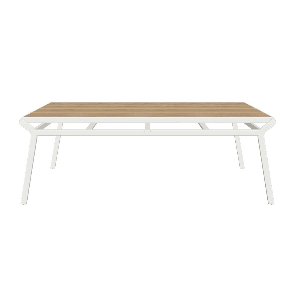 Powder-Coated Aluminum frame is featured in our White finish. Aluminum is precision welded, hand finished and powder-coated to create a solid foundation. Solid Teak top is sanded and oiled to allow the natural wood grain to shine.