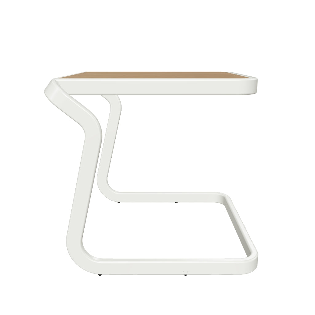 Powder-Coated Aluminum frame is featured in our White finish. Aluminum is precision welded, hand finished and powder-coated to create a solid foundation. Solid Teak top is sanded and oiled to allow the natural wood grain to shine.