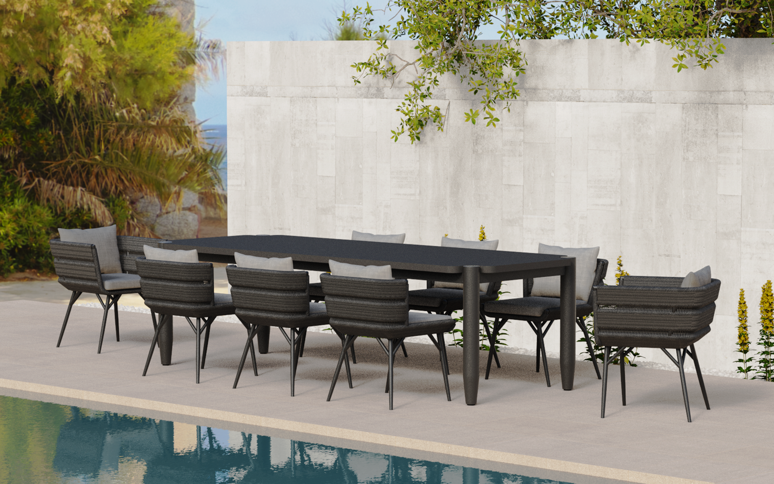 Seat cushion is made with an Open Cell Foam wrapped in Dacron. This allows water to flow through and drain. The back cushion is filled with a Foam, Poly, and Dacron blend to maintain shape over time.
